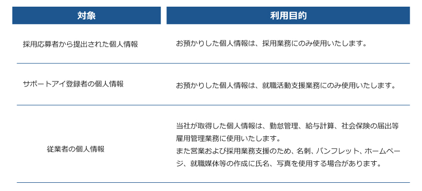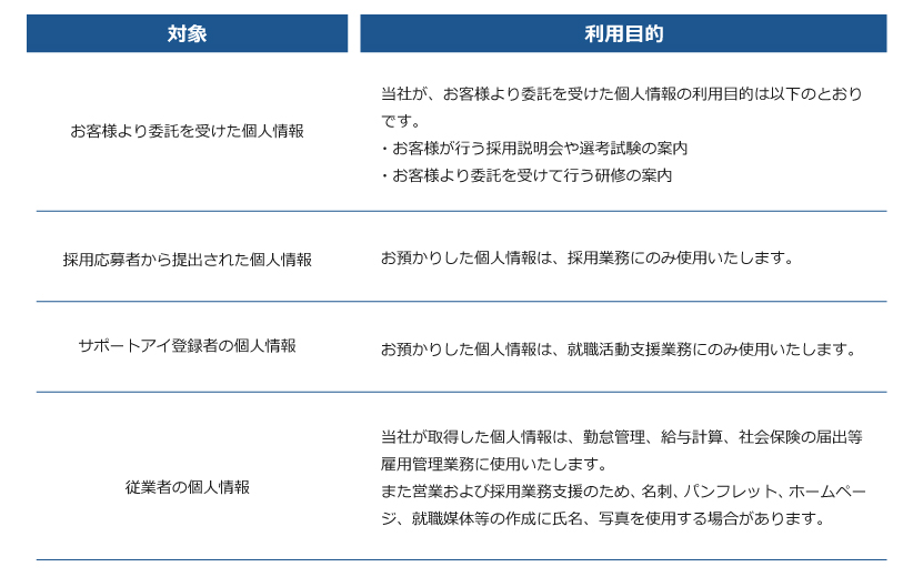 1) 当社は、人材開発業務を行う上で、学生や企業等などから預かる個人情報及び、その他社内で扱う全ての個人情報を保護するとの自覚を持ち、利用目的の達成に必要な範囲の適切な個人情報の取得、利用及び提供を行い、また目的外利用を行わないための具体的な措置を講じます。